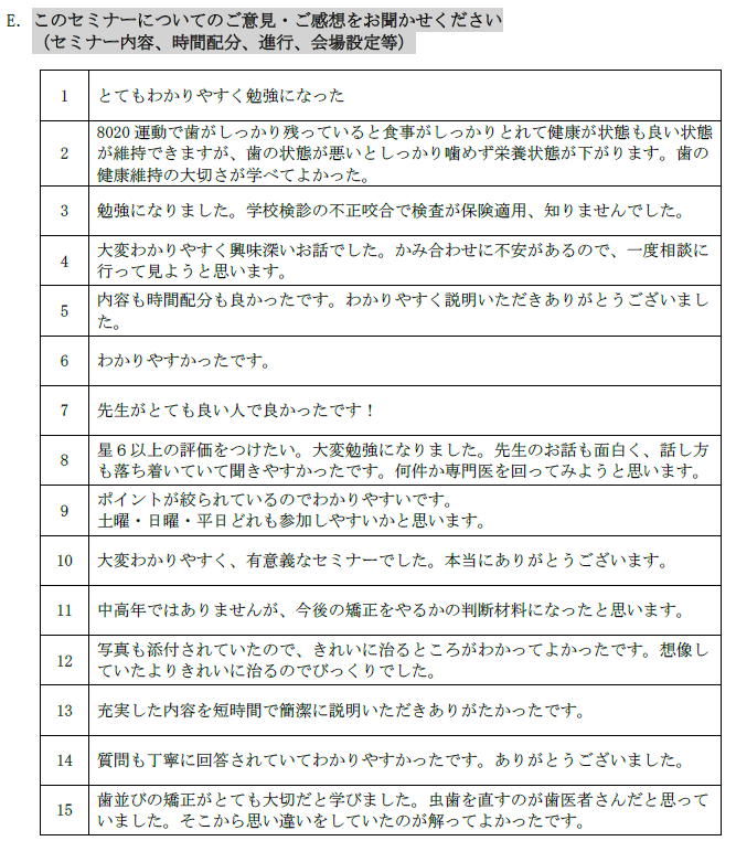 など、温かいご感想を多くいただきました。中には「かみ合わせに不安があるので相談に行ってみようと思います」という声もあり、講演を通じて“歯の健康を見直すきっかけ”を提供できたことを嬉しく思います。